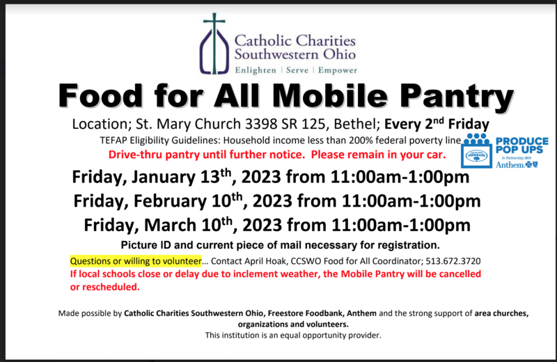 The Food For All Mobile Pantry will be coming to Bethel every second Friday in January, February, and March. The drive through pantry will be located at St. Mary Church, 3398 SR 125.