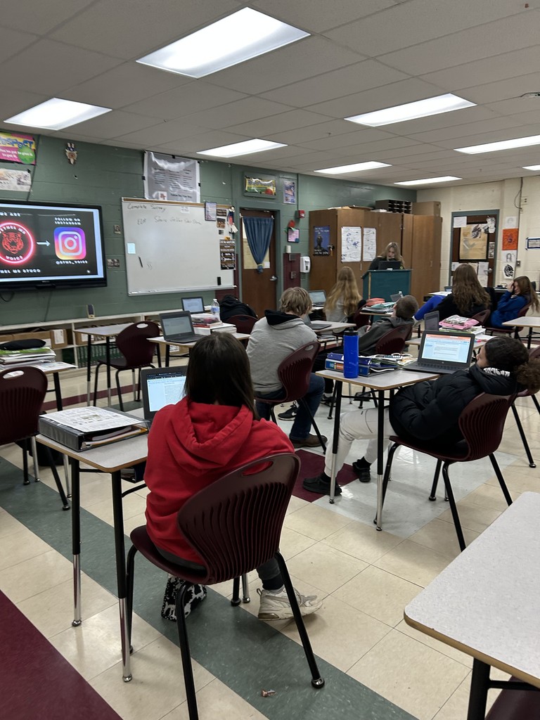 Students in Mrs. Starline’s language arts class took part in a fun writing challenge. Using illustrations displayed on the screen for inspiration, they wrote creative sentences and then combined their ideas to form a silly story, which they shared with a partner.